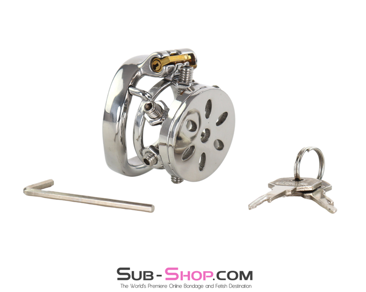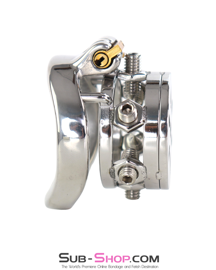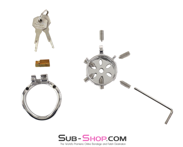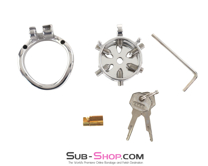 Designed with six adjustable internal spikes, this heavy-duty steel chastity device ensures total restriction while allowing for precision pressure control. The high-security pin tumbler keyway guarantees complete dominance, making escape impossible.