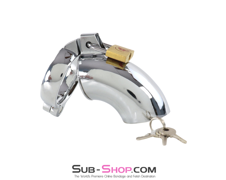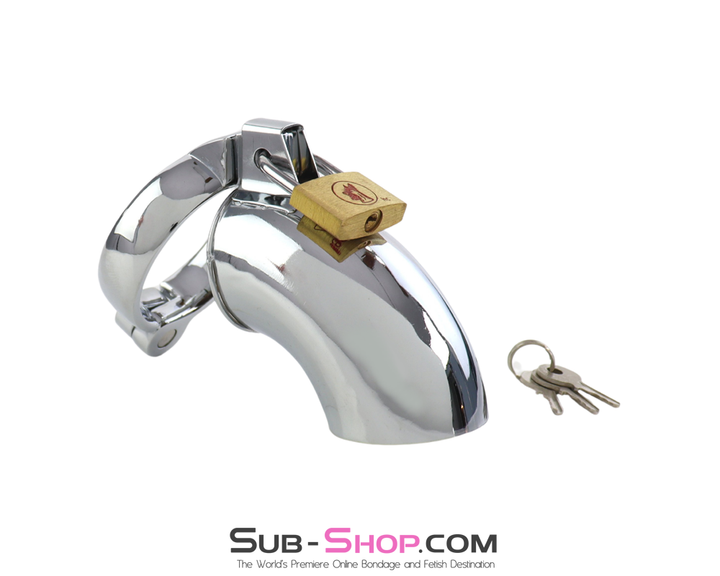 The cock cage attaches to accompanying chromed steel cock ring locked behind the balls. The steel chastity tube measures 3 1/2" long with an inside diameter of 1 3/8". The chrome cock ring is available in two sizes, choose from 1.5" or 2" inside diameter.